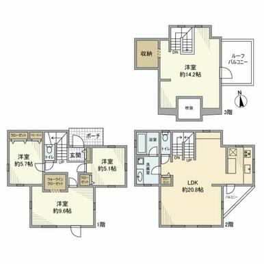 4LDK(LDK20.8、洋14.2、洋5.1、洋5.7、洋9.6) |